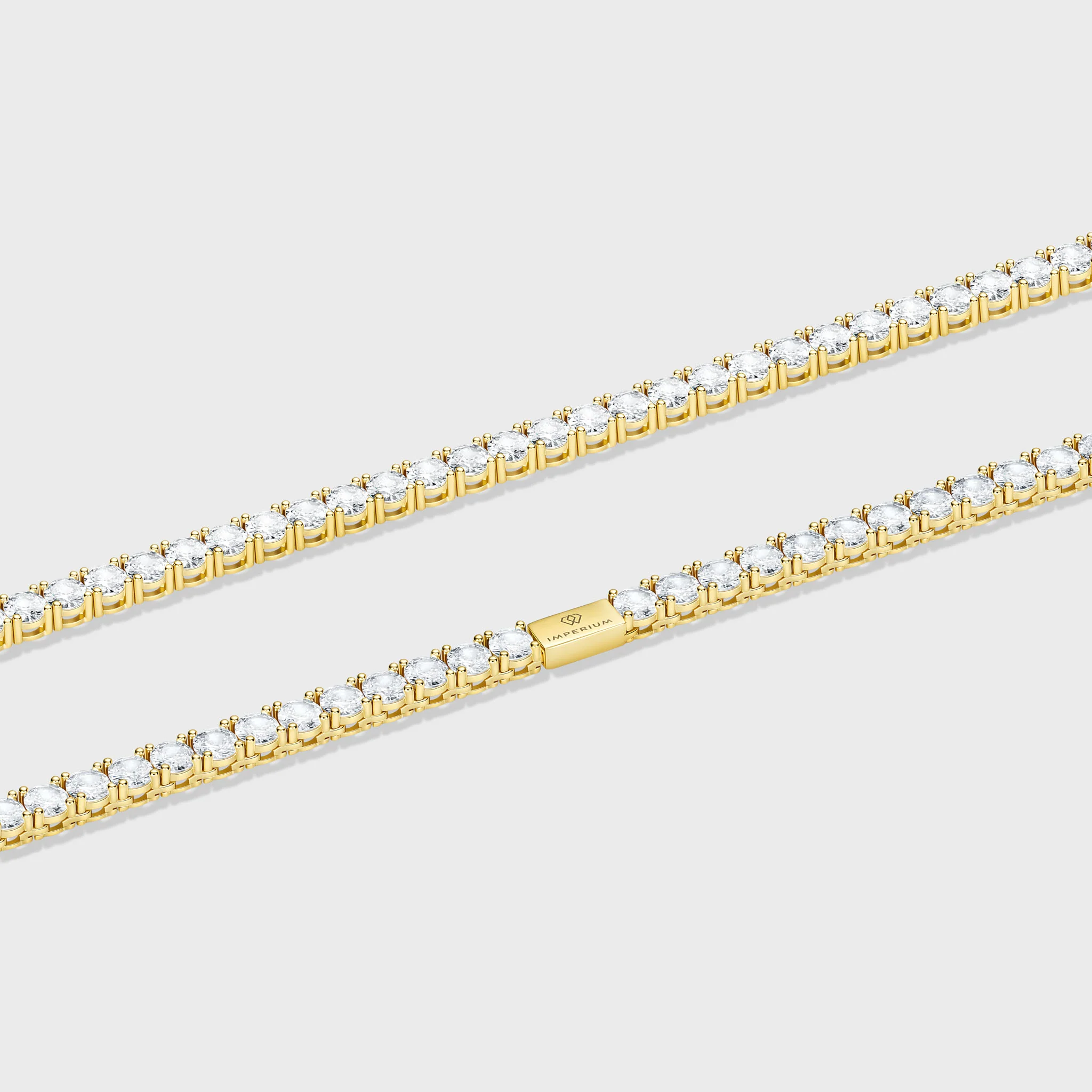 Introducing the ultimate tennis chain stack that will elevate your style to the next level. This pack features our stunning 5mm gold tennis chain and the sleek 3mm tennis chain, both made from high-quality materials and crafted to perfection. The 5mm chain provides a bold and eye-catching look, while the 3mm chain adds a subtle and sophisticated touch. Wear them together or separately to suit your style, either way, you're guaranteed to turn heads with the extreme shine and superior quality of this tennis chain duo. Made with real 18K Gold Bonded.